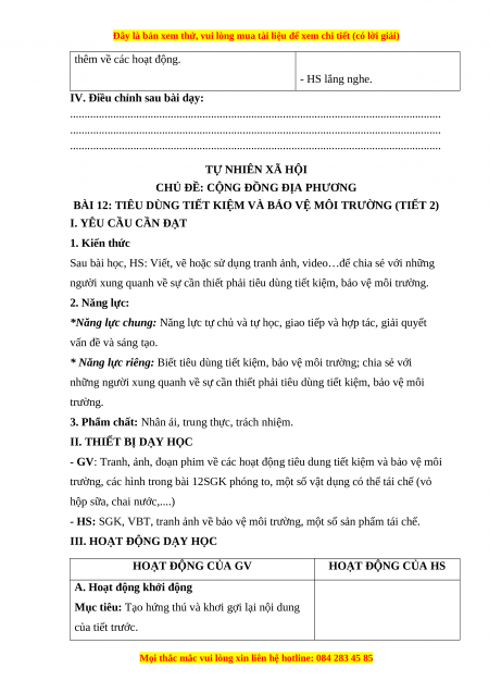 * Năng lực riêng: Biết tiêu dùng tiết kiệm, bảo vệ môi trường; chia sẻ với