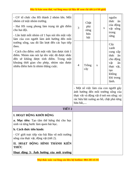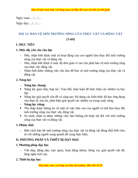 BÀI 12: BẢO VỆ MÔI TRƯỜNG SỐNG CỦA THỰC VẬT VÀ ĐỘNG VẬT (3 tiết) I. MỤC TIÊU