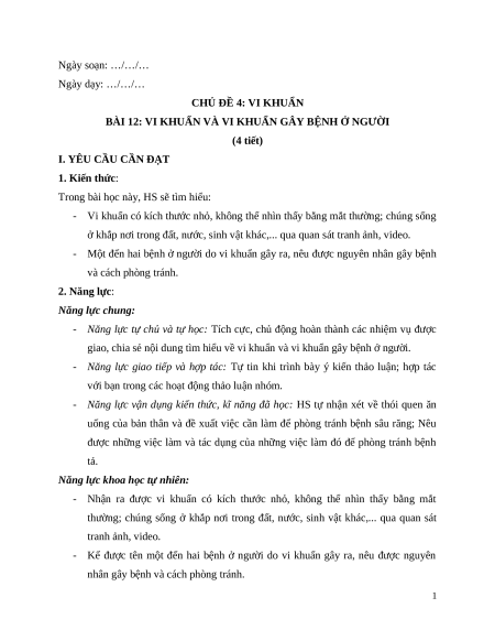 - Một đến hai bệnh ở người do vi khuẩn gây ra, nêu được nguyên nhân gây bệnh và cách phòng tránh. 2. Năng lực: