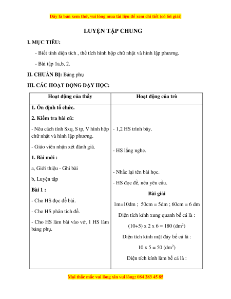 - Biết tính diện tích , thể tích hình hộp chữ nhật và hình lập phương. - Bài tập 1a,b, 2.