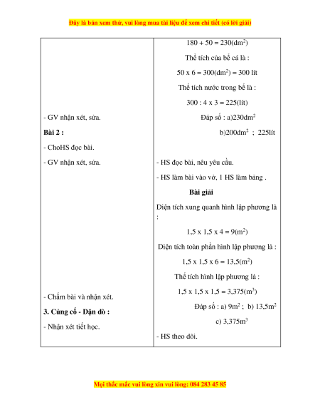 Thể tích nước trong bể là : 300 : 4 x 3 = 225(lít) - GV nhận xét, sửa. Đáp số : a)230dm2 Bài 2 : b)200dm2 ; 225lít - ChoHS đọc bài. - GV nhận xét, sửa.