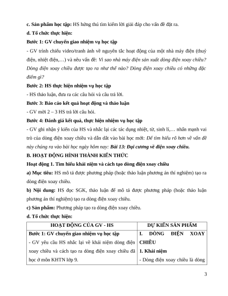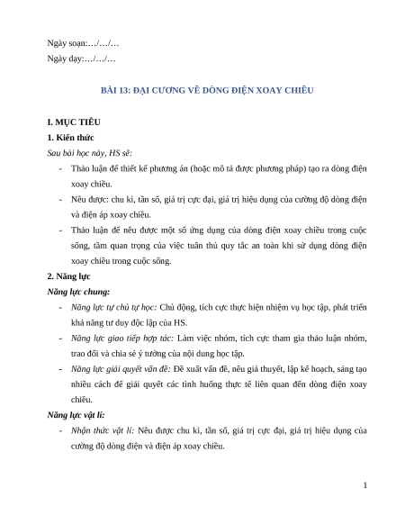 BÀI 13: ĐẠI CƯƠNG VỀ DÒNG ĐIỆN XOAY CHIỀU I. MỤC TIÊU 1. Kiến thức