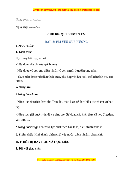 BÀI 13: EM YÊU QUÊ HƯƠNG I. MỤC TIÊU 1. Kiến thức Học xong bài này, em sẽ: