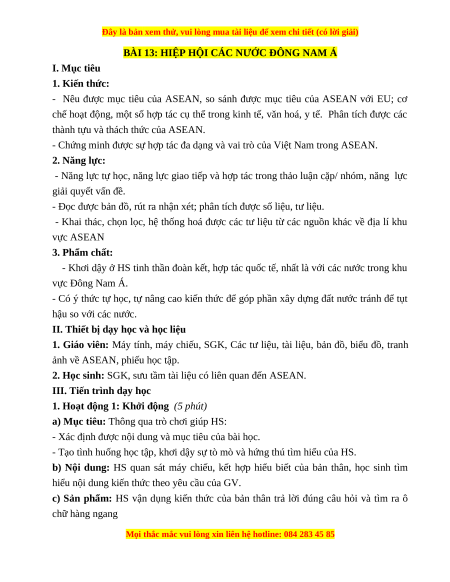 BÀI 13: HIỆP HỘI CÁC NƯỚC ĐÔNG NAM Á I. Mục tiêu 1. Kiến thức: