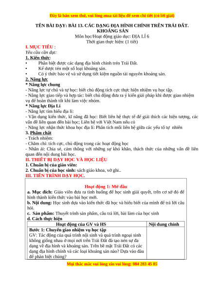 Giáo án Bài 13 Địa lí 6 Kết nối tri thức (2024): Các dạng địa hình chính trên Trái Đất. Khoáng sản