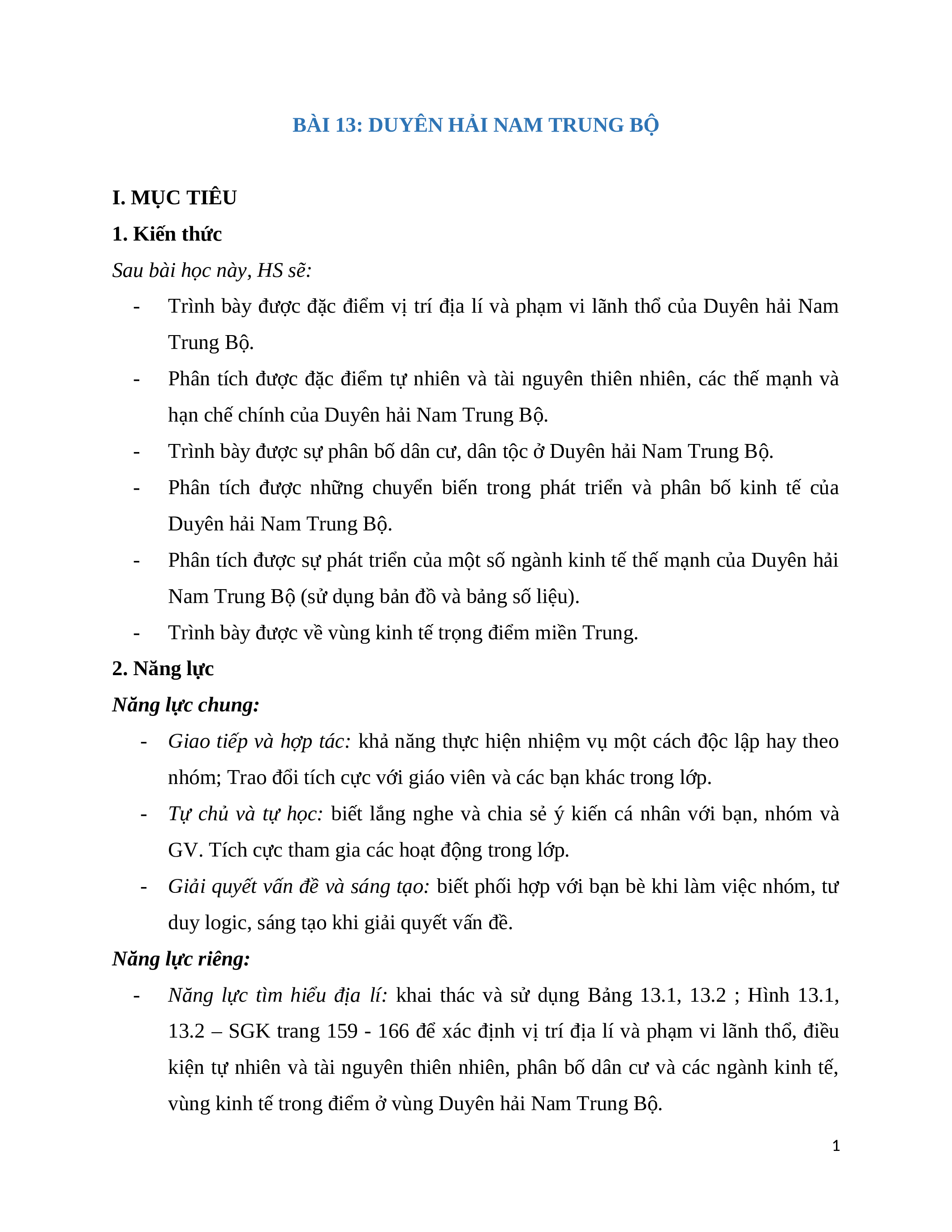 BÀI 13: DUYÊN HẢI NAM TRUNG BỘ I. MỤC TIÊU 1. Kiến thức