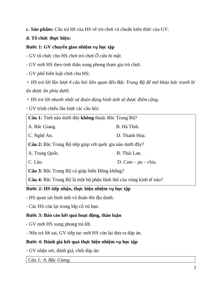 + HS trả lời lần lượt 4 câu hỏi liên quan đến Bắc Trung Bộ để mở khóa bức tranh bí