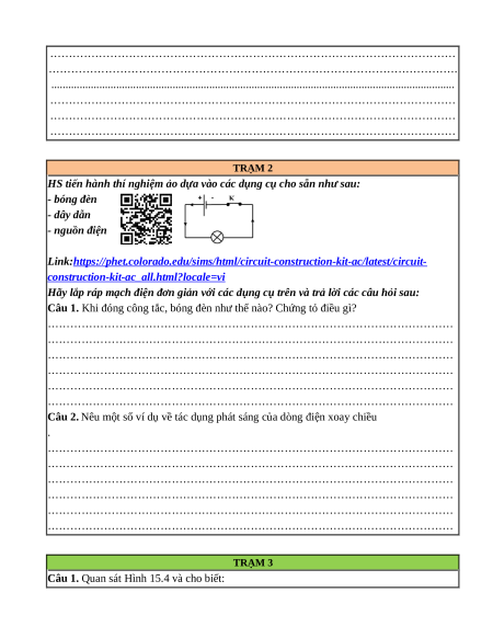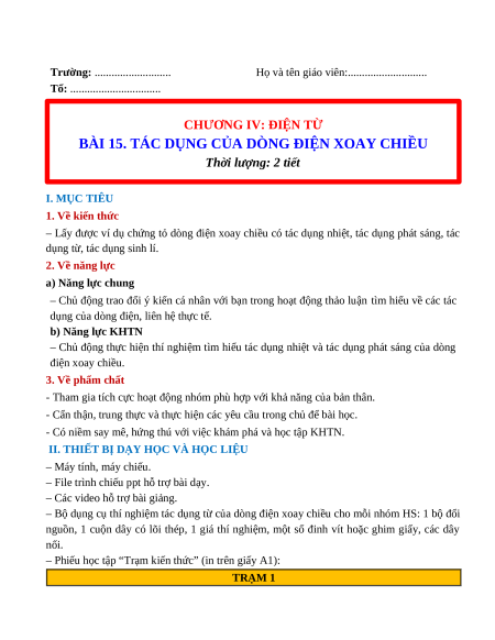 – Chủ động thực hiện thí nghiệm tìm hiểu tác dụng nhiệt và tác dụng phát sáng của dòng điện xoay chiều. 3. Về phẩm chất