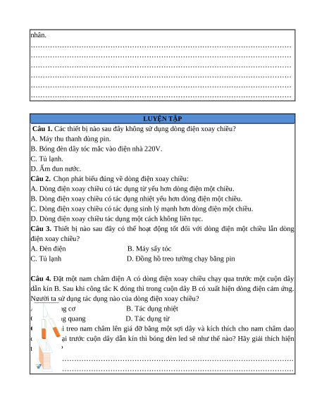 Câu 3. Nêu một số ví dụ về thiết bị điện sử dụng dòng điện xoay chiều có tác dụng nhiệt,