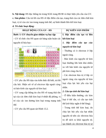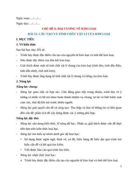 Giáo án Bài 13 Hóa học 12 Cánh Diều: Cấu tạo và tính chất vật lí của kim loại