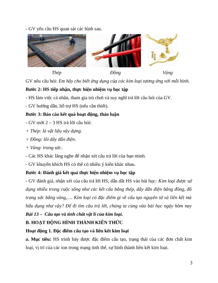 - Huy động được vốn hiểu biết, kĩ năng có sẵn của học sinh về ứng dụng của kim loại