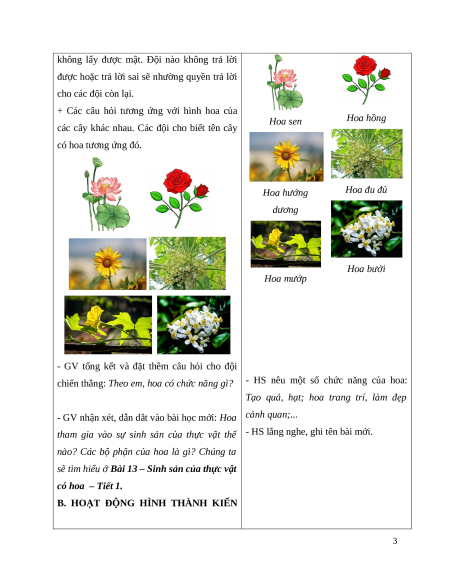 + Các câu hỏi tương ứng với hình hoa của Hoa sen Hoa hồng
