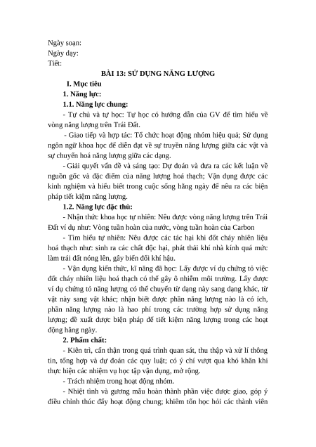BÀI 13: SỬ DỤNG NĂNG LƯỢNG I. Mục tiêu 1. Năng lực: 1.1. Năng lực chung: