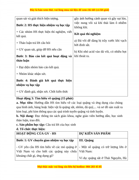 (đá vôi, quặng...), các khoáng chất chính có trong đá vôi, quặng (độ cứng, màu sắc,