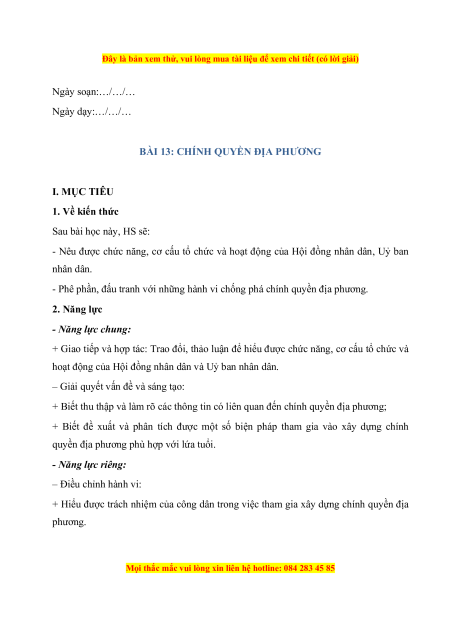BÀI 13: CHÍNH QUYỀN ĐỊA PHƯƠNG I. MỤC TIÊU 1. Về kiến thức Sau bài học này, HS sẽ: