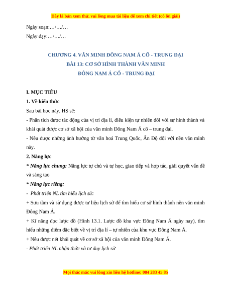 ĐÔNG NAM Á CỔ - TRUNG ĐẠI I. MỤC TIÊU 1. Về kiến thức Sau bài học này, HS sẽ: