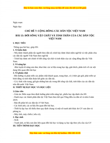 BÀI 13: ĐỜI SỐNG VẬT CHẤT VÀ TINH THẦN CỦA CÁC DÂN TỘC VIỆT NAM I. MỤC TIÊU