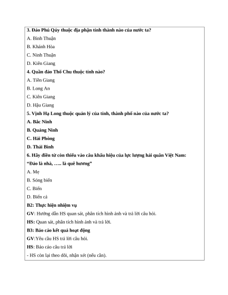 3. Đảo Phú Qúy thuộc địa phận tỉnh thành nào của nước ta? A. Bình Thuận B. Khánh Hòa C. Ninh Thuận D. Kiên Giang