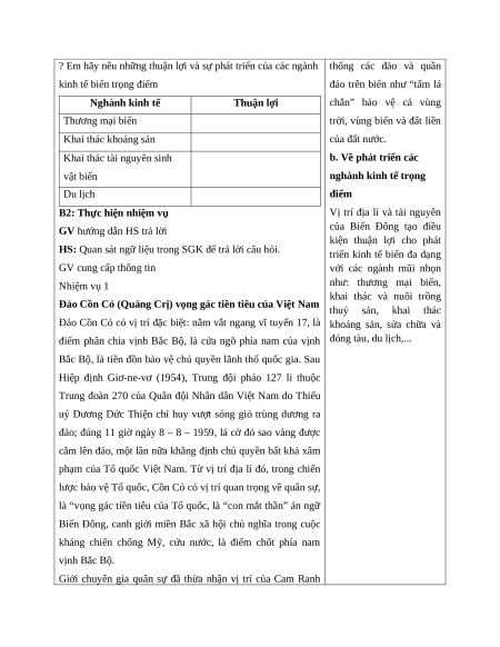 Nhiệm vụ 2: Về phát triển các nghành kinh tế trọng điểm Biển Đông là tuyến