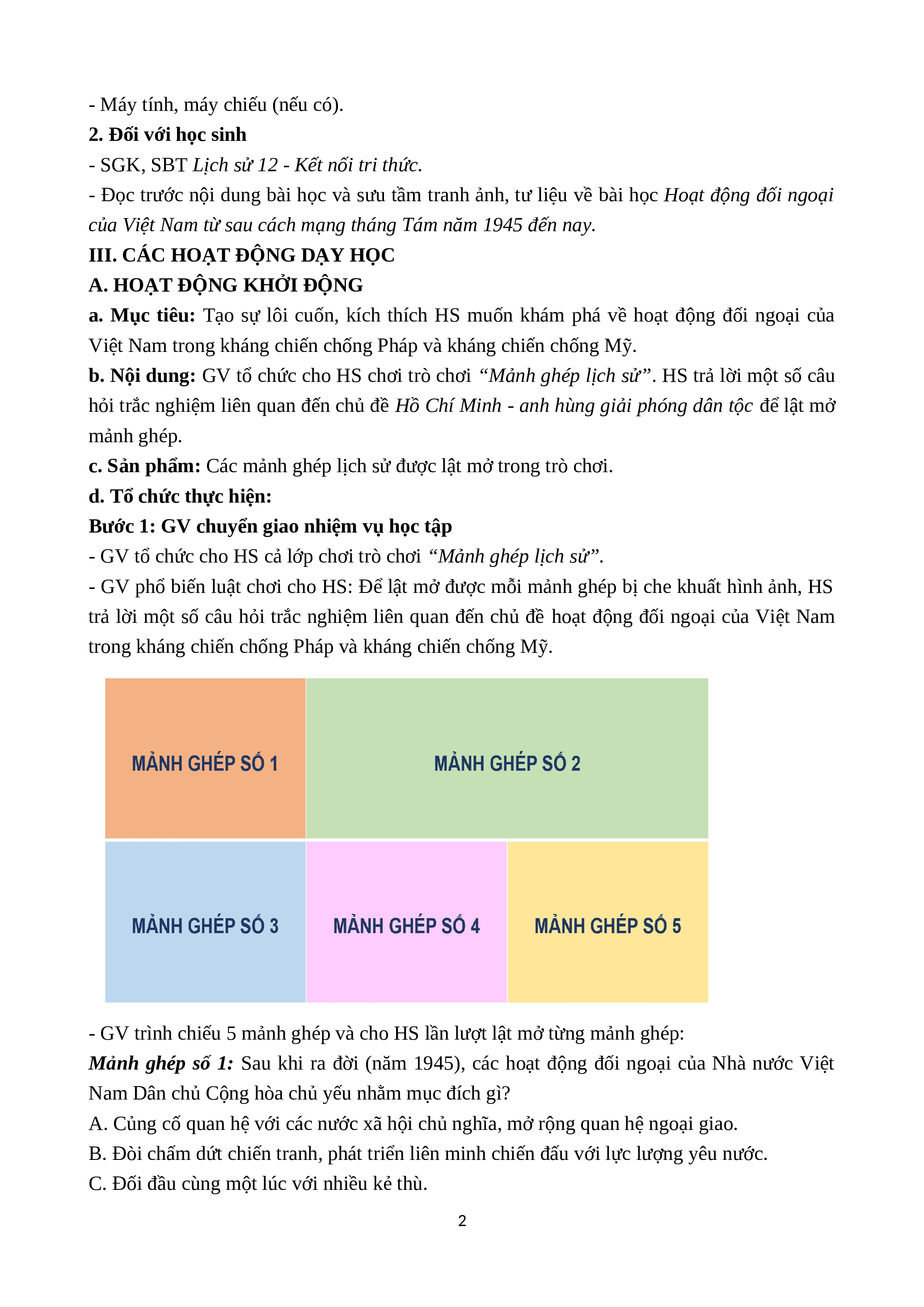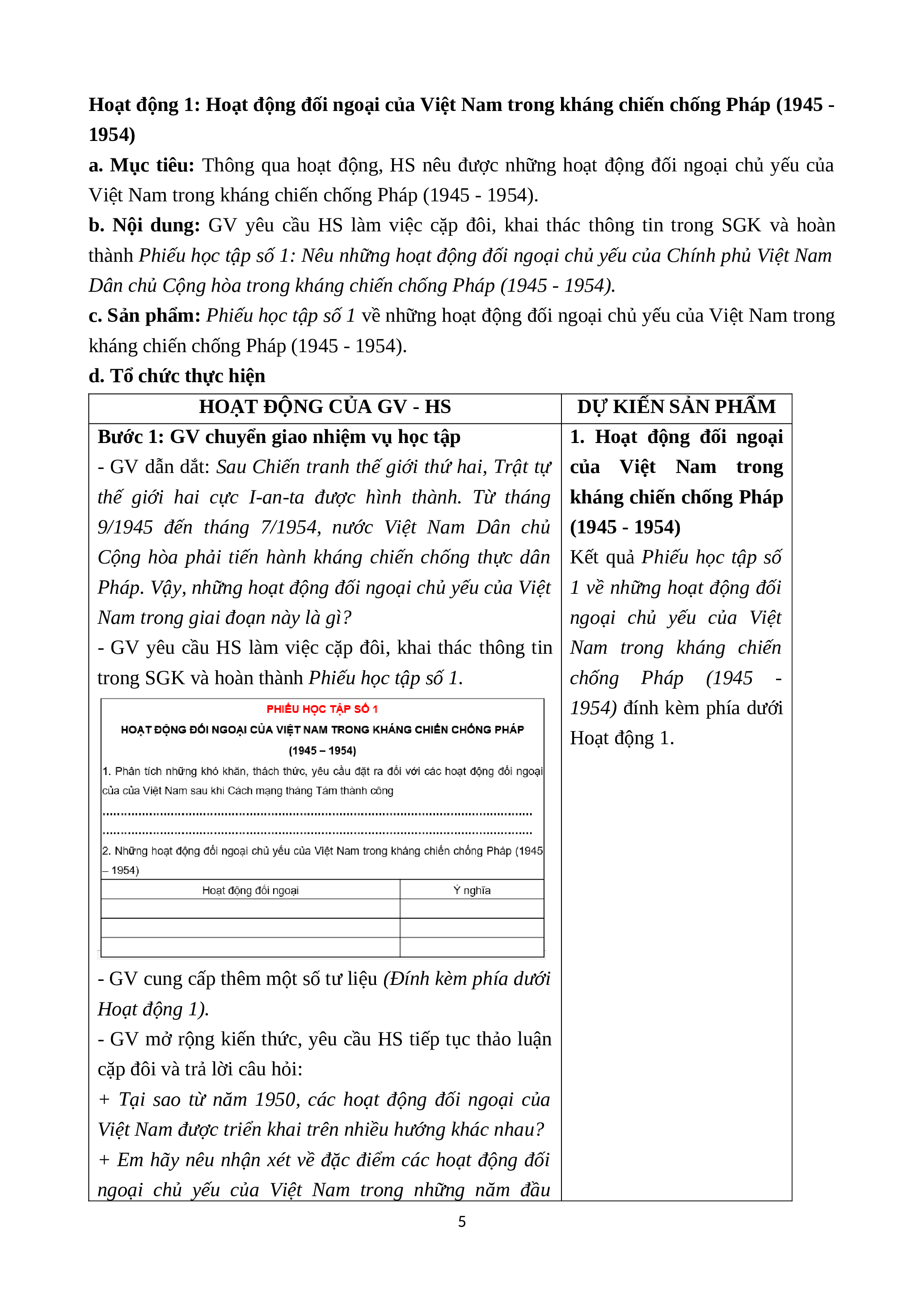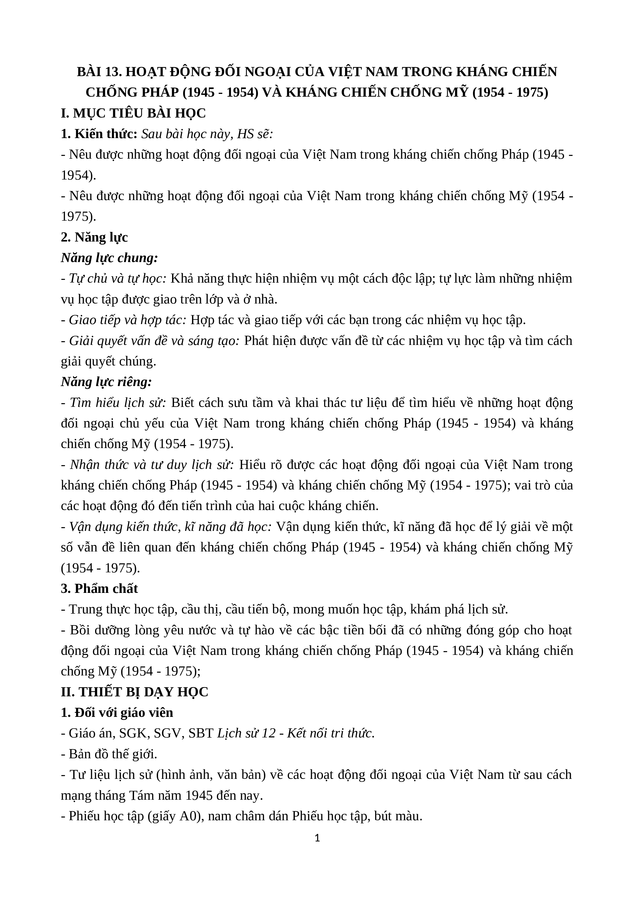 Giáo án Bài 13 Lịch sử 12 Kết nối tri thức: Hoạt động đối ngoại của Việt Nam trong kháng chiến chống Pháp (1945 - 1954) và kháng chiến chống Mỹ (1954 - 1975)