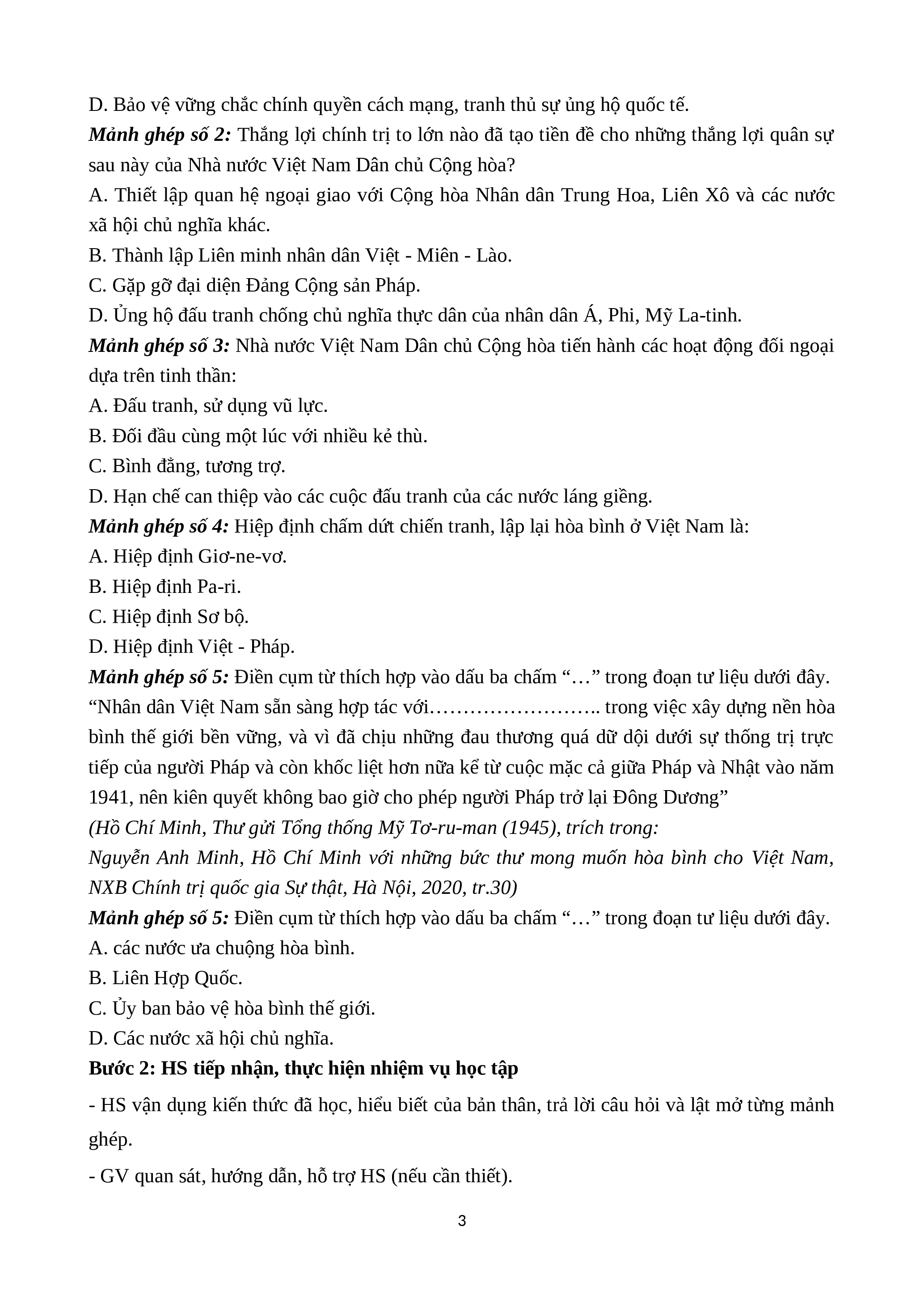 Mảnh ghép số 3: Nhà nước Việt Nam Dân chủ Cộng hòa tiến hành các hoạt động đối ngoại dựa trên tinh thần:
