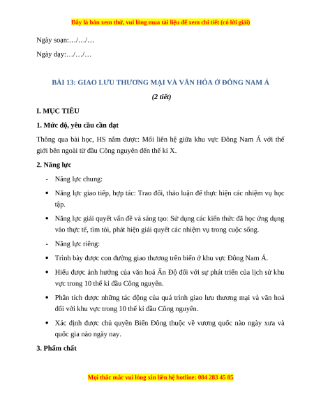 BÀI 13: GIAO LƯU THƯƠNG MẠI VÀ VĂN HÓA Ở ĐÔNG NAM Á (2 tiết) I. MỤC TIÊU