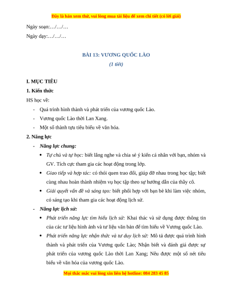 BÀI 13: VƯƠNG QUỐC LÀO (1 tiết) I. MỤC TIÊU 1. Kiến thức HS học về: