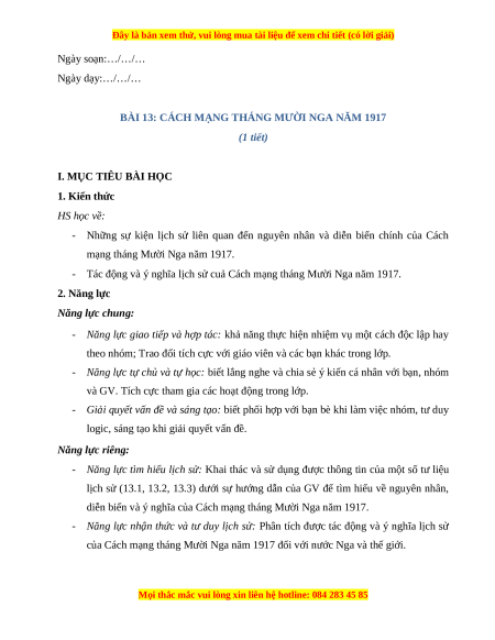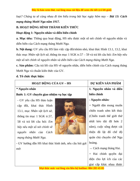BÀI 13: CÁCH MẠNG THÁNG MƯỜI NGA NĂM 1917 (1 tiết)