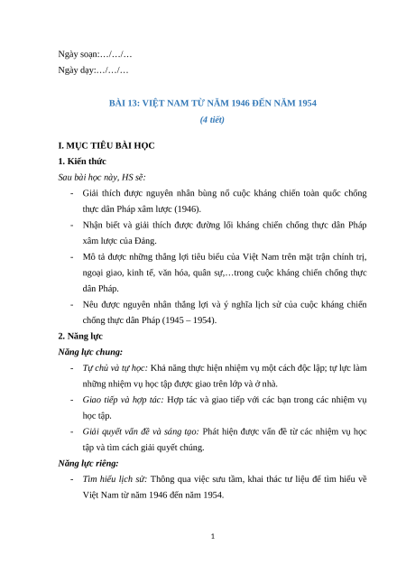 BÀI 13: VIỆT NAM TỪ NĂM 1946 ĐẾN NĂM 1954 (4 tiết)