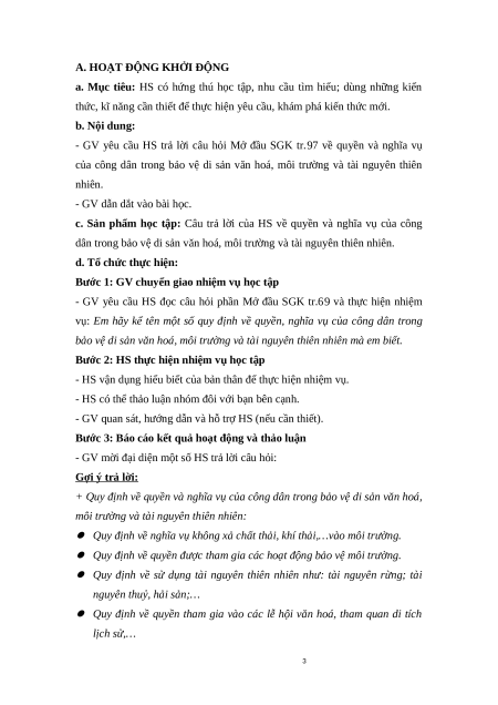 của công dân trong bảo vệ di sản văn hoá, môi trường và tài nguyên thiên nhiên. 3. Phẩm chất: