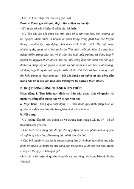 - GV rút ra kết luận về quyền và nghĩa vụ của công dân trong bảo vệ di sản văn hoá. 4