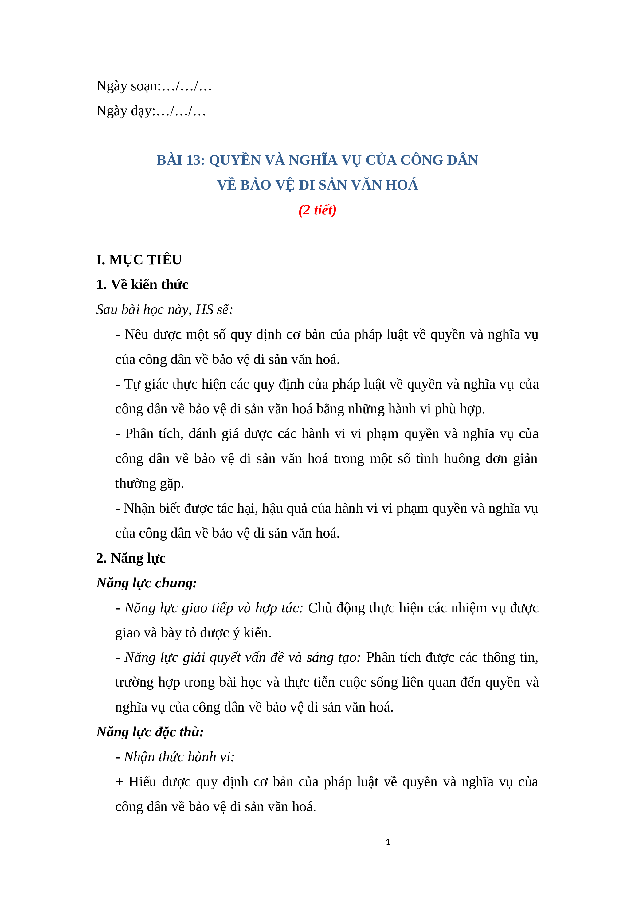 Giáo án Bài 13. Quyền và nghĩa vụ của công dân về bảo vệ di sản văn hóa KTPL 12 Cánh diều