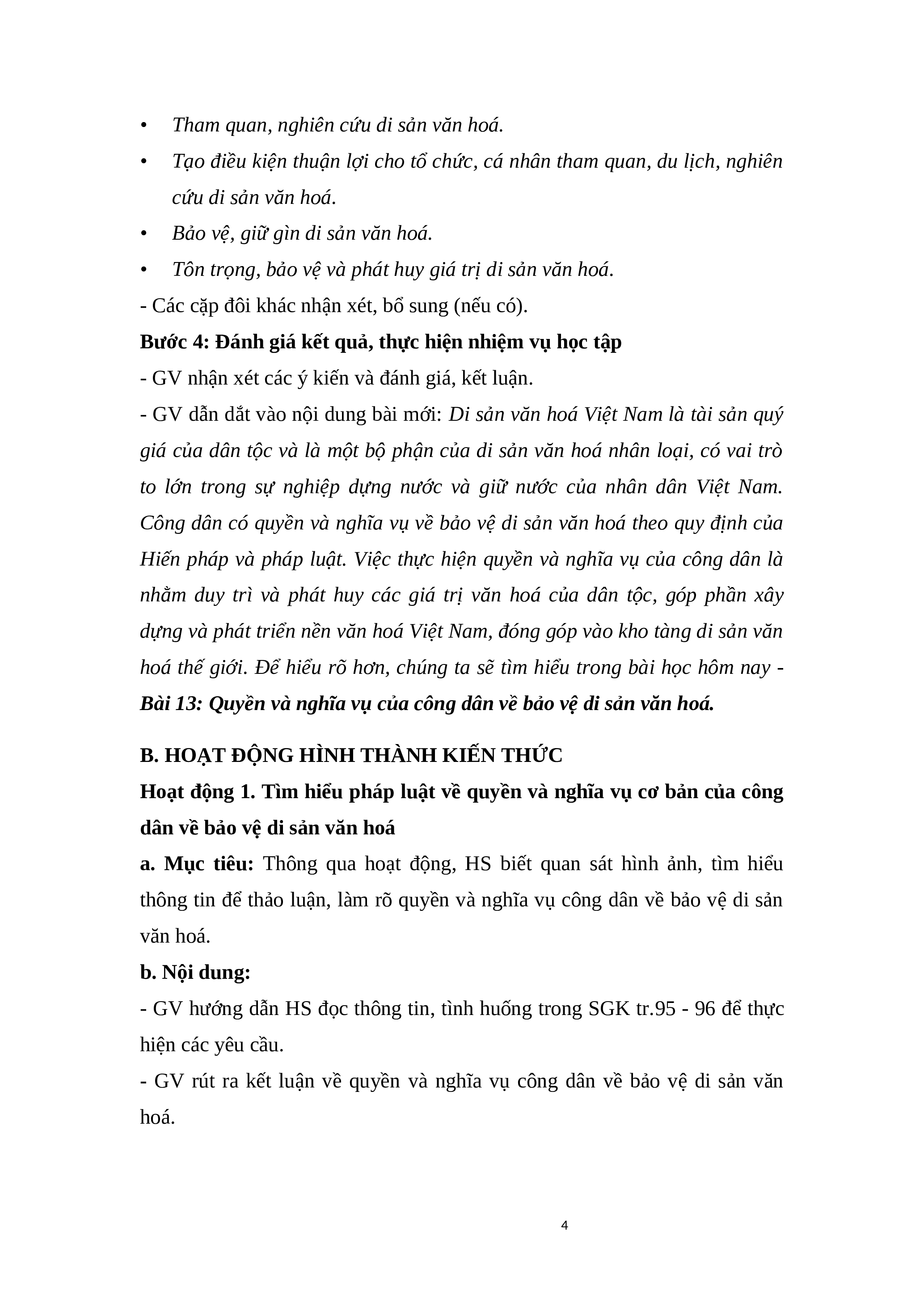 - GV rút ra kết luận về quyền và nghĩa vụ công dân về bảo vệ di sản văn hoá. 4