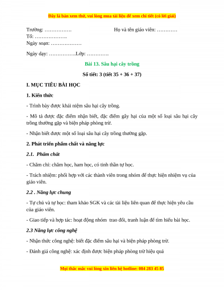 Giáo án Bài 13: Sâu hại cây trồng Công nghệ 10 Cánh diều