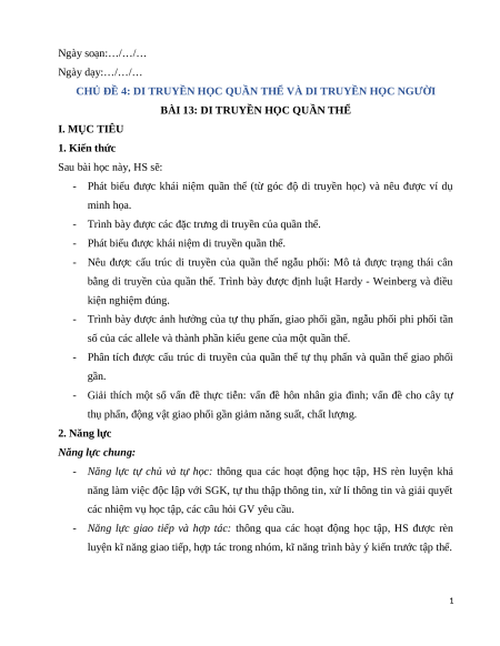 BÀI 13: DI TRUYỀN HỌC QUẦN THỂ I. MỤC TIÊU 1. Kiến thức Sau bài học này, HS sẽ: