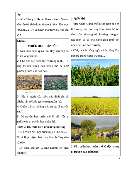 c. Sản phẩm học tập: Khái niệm quần thể (từ góc độ di truyền học), một số đặc trưng di