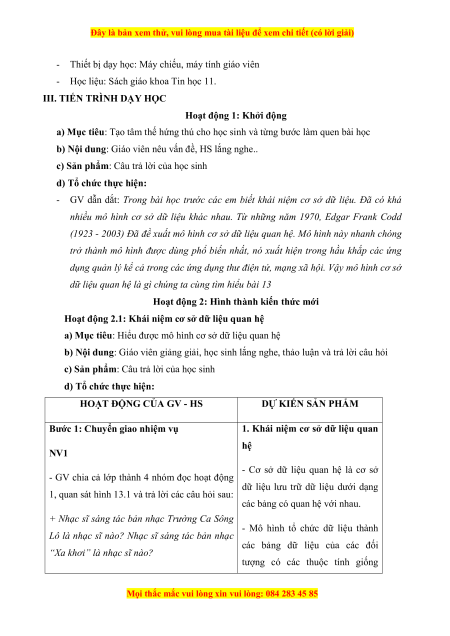Giáo án Bài 13 Tin 11 Kết nối tri thức: Cơ sở dữ liệu quan hệ