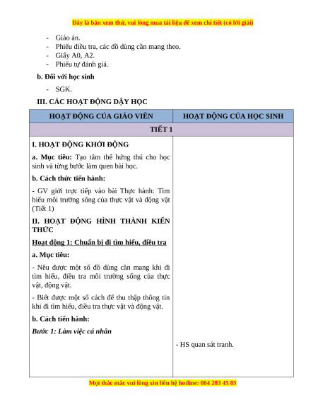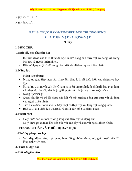 - Có ý thức bảo vệ môi trường sống của thực vật và động vật.