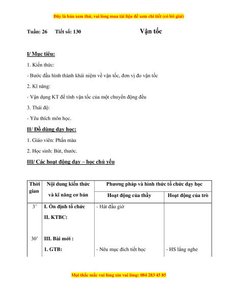 Tuần: 26 Tiết số: 130 Vận tốc I/ Mục tiêu: 1. Kiến thức: