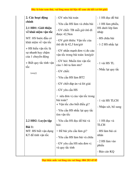 - Bước đầu hình thành khái niệm về vận tốc, đơn vị đo vận tốc 2. Kĩ năng: