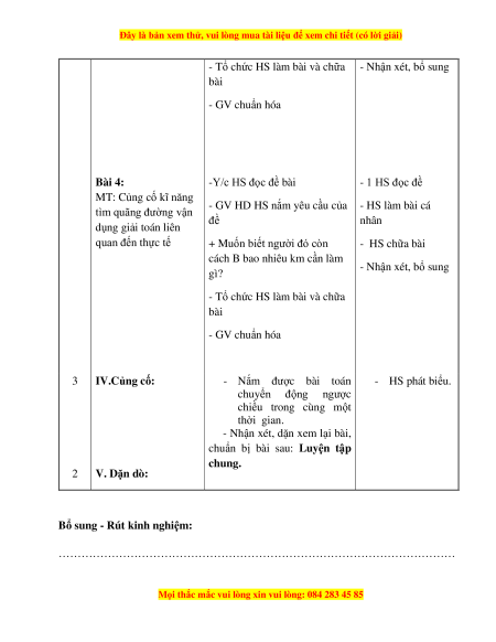 - Tổ chức HS làm bài và chữa bài - GV chuẩn hóa 3 IV.Củng cố: - Nắm được bài toán - HS phát biểu. chuyển động ngược chiều trong cùng một thời gian.