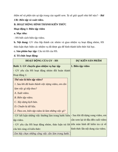 Hoạt động 1: Biên tập video a. Mục tiêu: