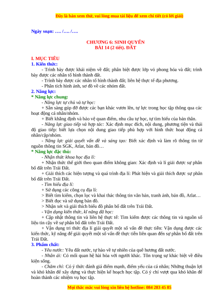 BÀI 14 (2 tiết). ĐẤT I. MỤC TIÊU 1. Kiến thức: