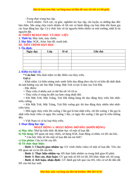 * Câu hỏi: Nêu khái niệm và đặc điểm của thủy triều. Gợi ý: