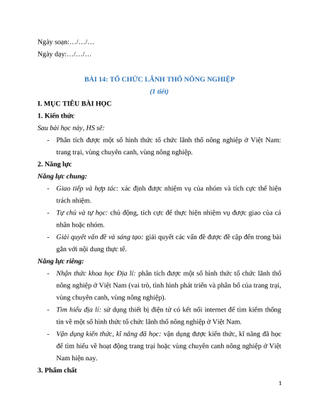 Giáo án Bài 14 Địa lí 12 Chân trời sáng tạo (2024): Tổ chức lãnh thổ nông nghiệp