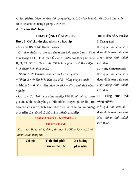 c. Sản phẩm: Báo cáo lãnh thổ nông nghiệp 1, 2, 3 của các nhóm về một số hình thức