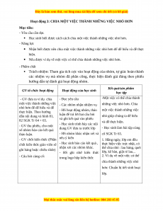 Hoạt động 3: CHIA MỘT VIỆC THÀNH NHỮNG VIỆC NHỎ HƠN Mục tiêu: - Yêu cầu cần đạt.
