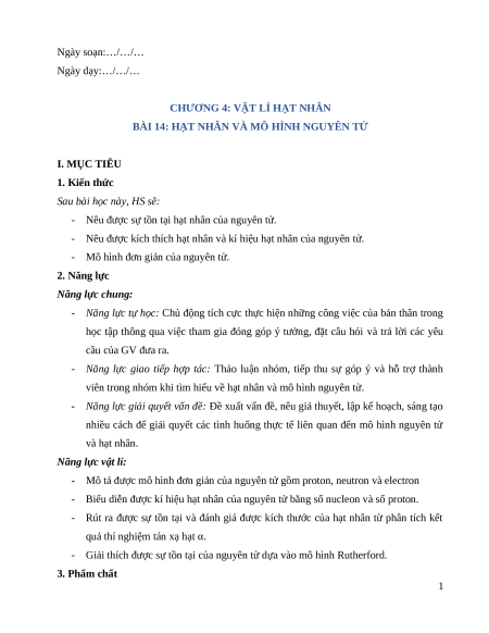 BÀI 14: HẠT NHÂN VÀ MÔ HÌNH NGUYÊN TỬ I. MỤC TIÊU 1. Kiến thức