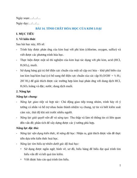 BÀI 14. TÍNH CHẤT HÓA HỌC CỦA KIM LOẠI I. MỤC TIÊU 1. Về kiến thức Sau bài học này, HS sẽ: