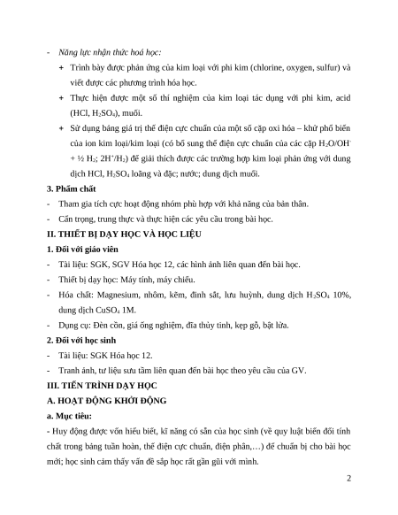 Giáo án Bài 14 Hóa học 12 Cánh Diều: Tính chất hoá học của kim loại